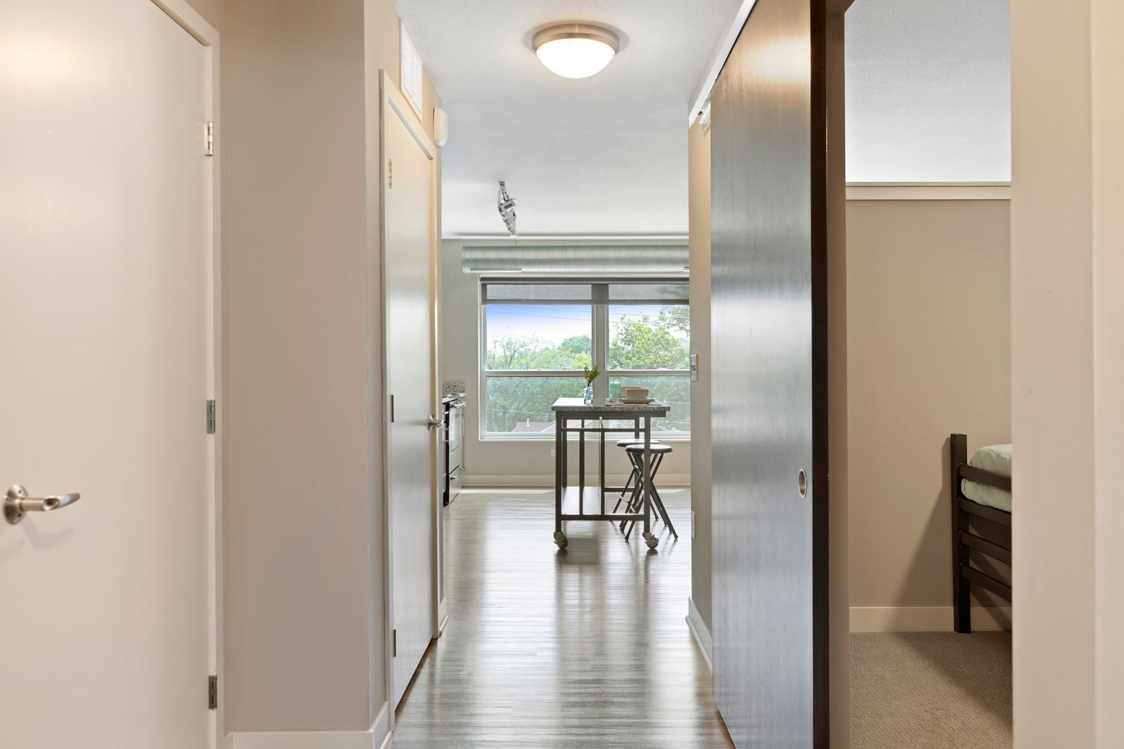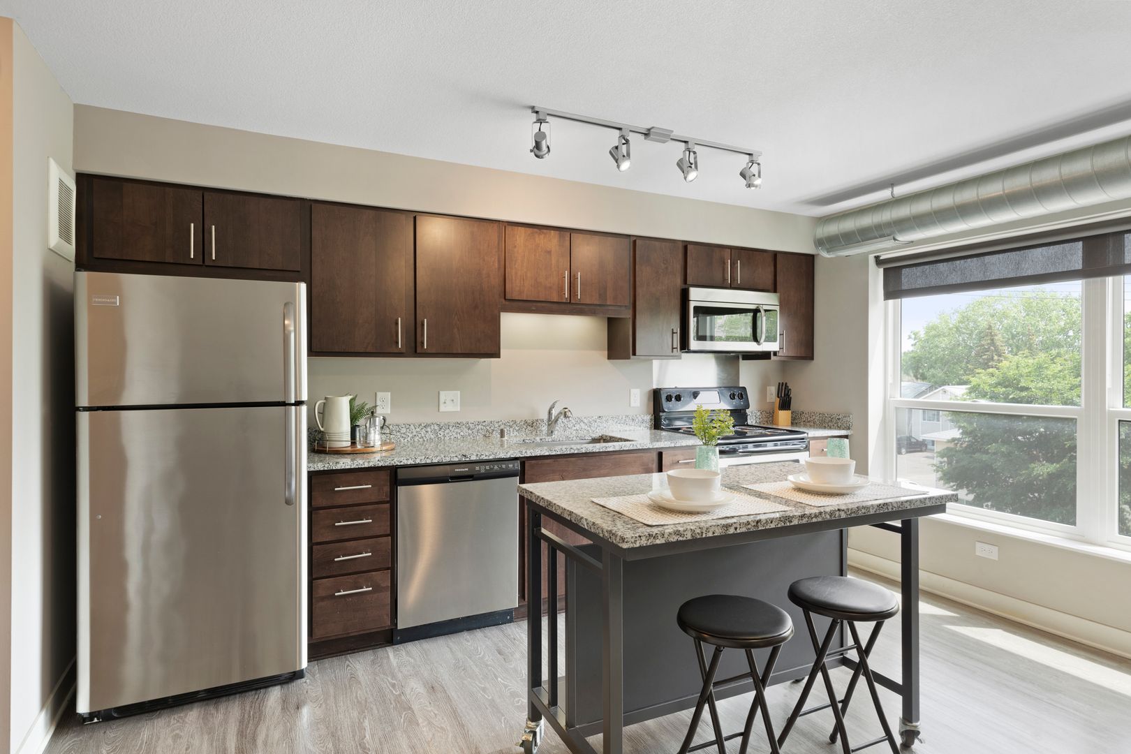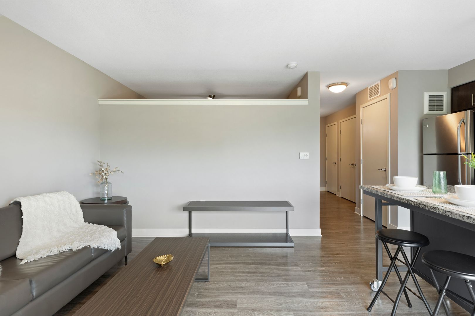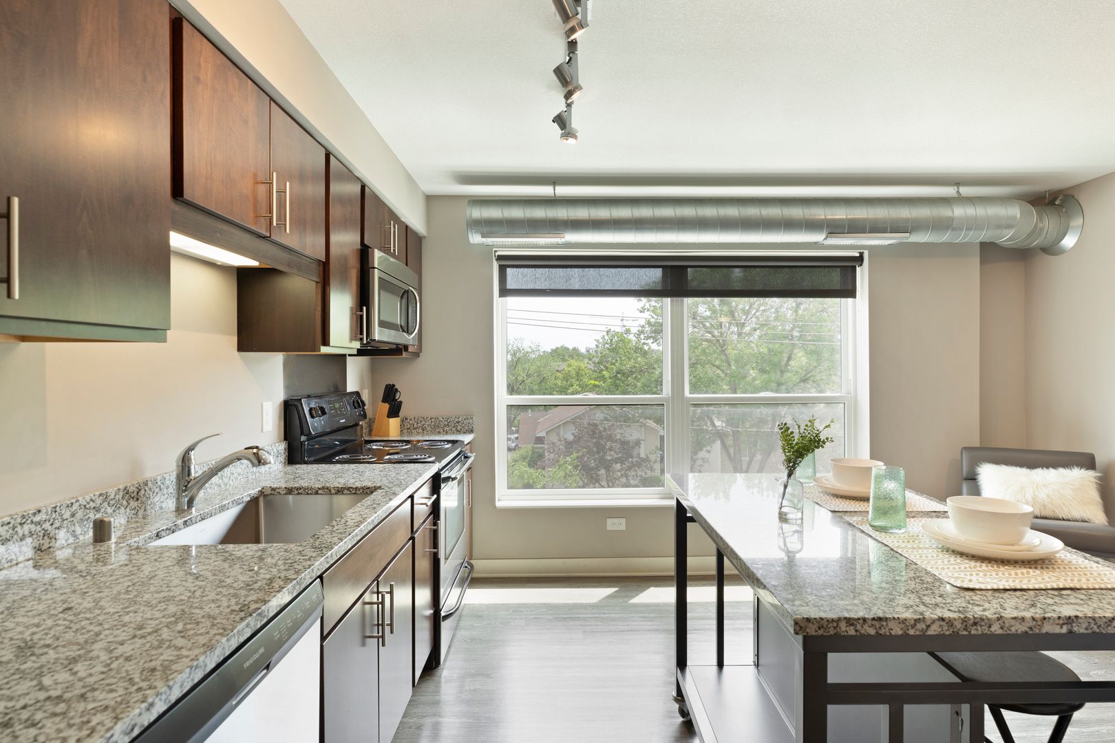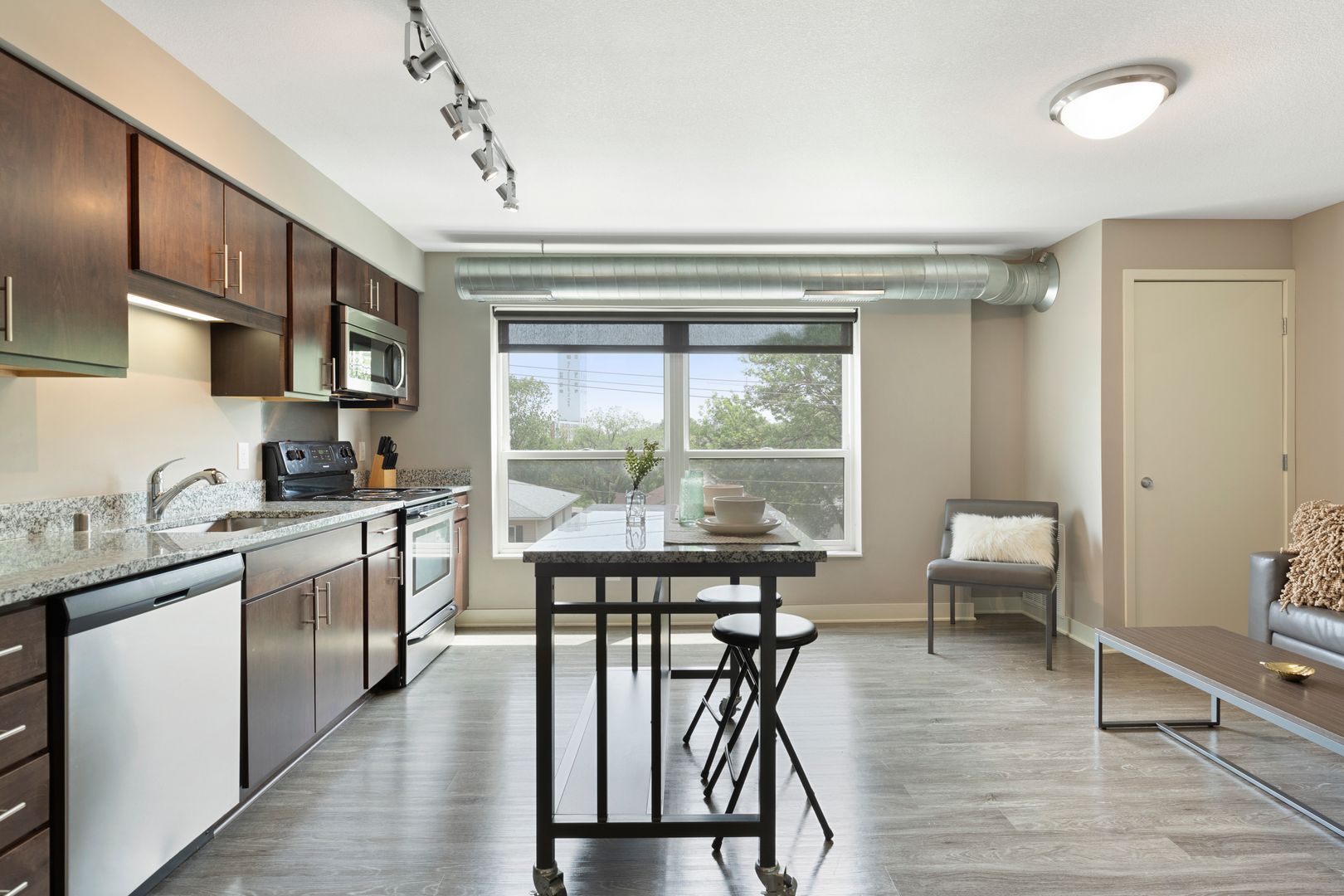 Our one bedroom and one bathroom units offer the best mix of spacious living and modern convenience, with in-unit laundry, direct fiber internet available and upscale appliances. They also feature solid flooring, spacious closets, expansive windows, modern bathrooms, convenient roller shades, and more, providing incomparable comfort.