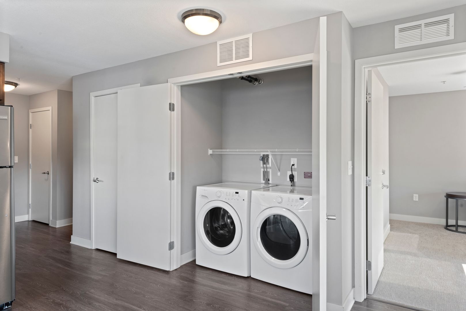 Our two bedroom, 2 bathroom units offer a hard to beat living experience, offering plenty of space for residents and modern amenities. They offer in-unit laundry, direct fiber internet available, and upscale appliances. These two bedroom layouts also feature solid flooring, spacious closets, expansive windows, modern bathrooms, convenient roller shades, and more.